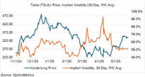 As you can see in the chart below, Tesla has been on a wild ride since the election in terms of both price and implied volatility. Since July, 2010, it’s implied volatility has averaged 54.7%; currently, it’s trading in the low- to mid-60s. I suspect if there is no new news over the next several weeks, TSLA implied volatility will drift lower. However, a shock, e.g. problems with the robotaxi rollout or some other unexpected setback to the business in general, may cause volatility to shoot back up.